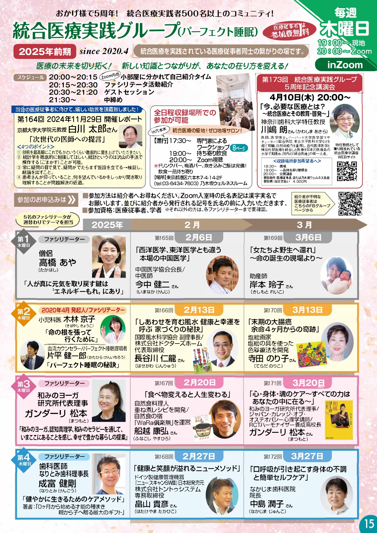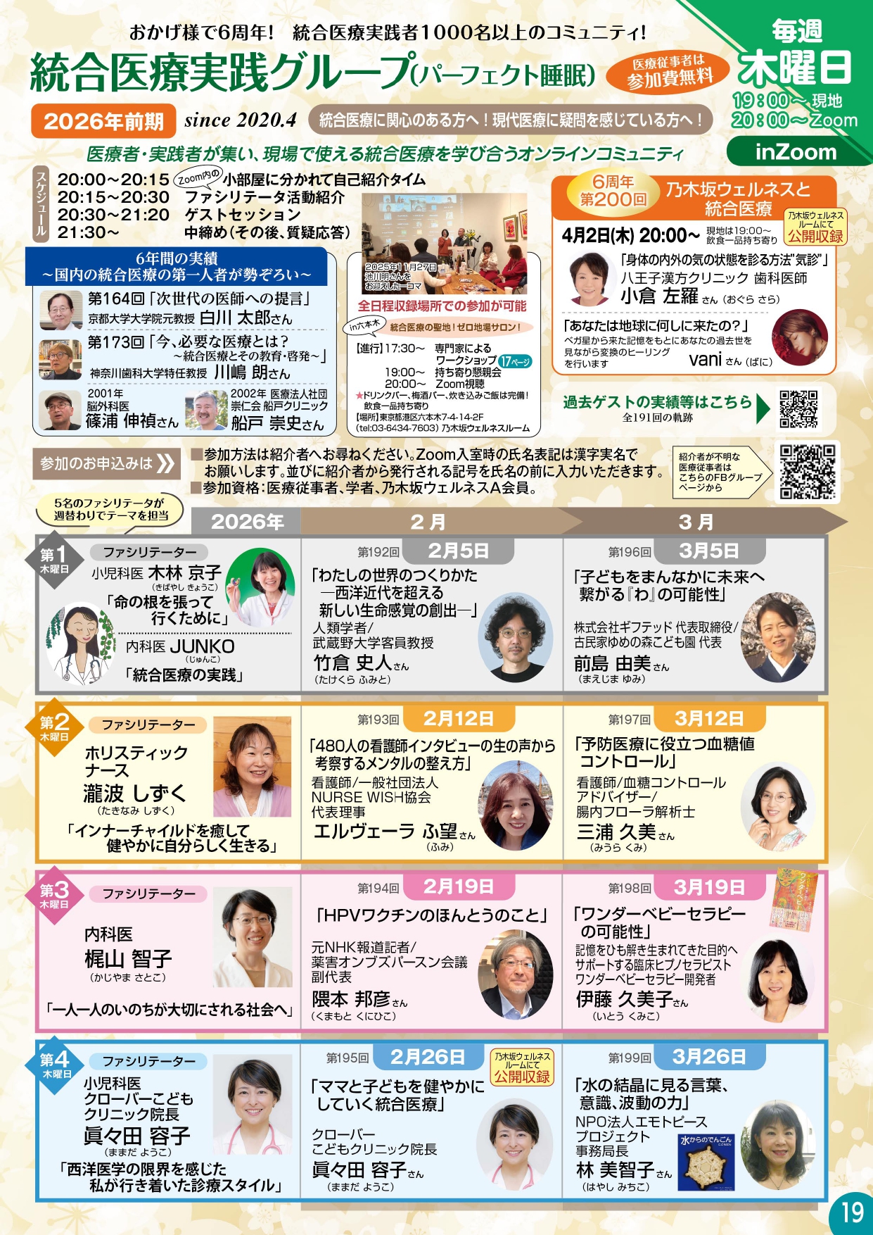 | 進行 | 〜17:30 施術体験、相談など 17:30〜19:00 ワークショップ 19:00〜20:00 持ち寄り懇親会 20:00〜 Zoom視聴 150インチの大型スクリーン、音響設備完備 |